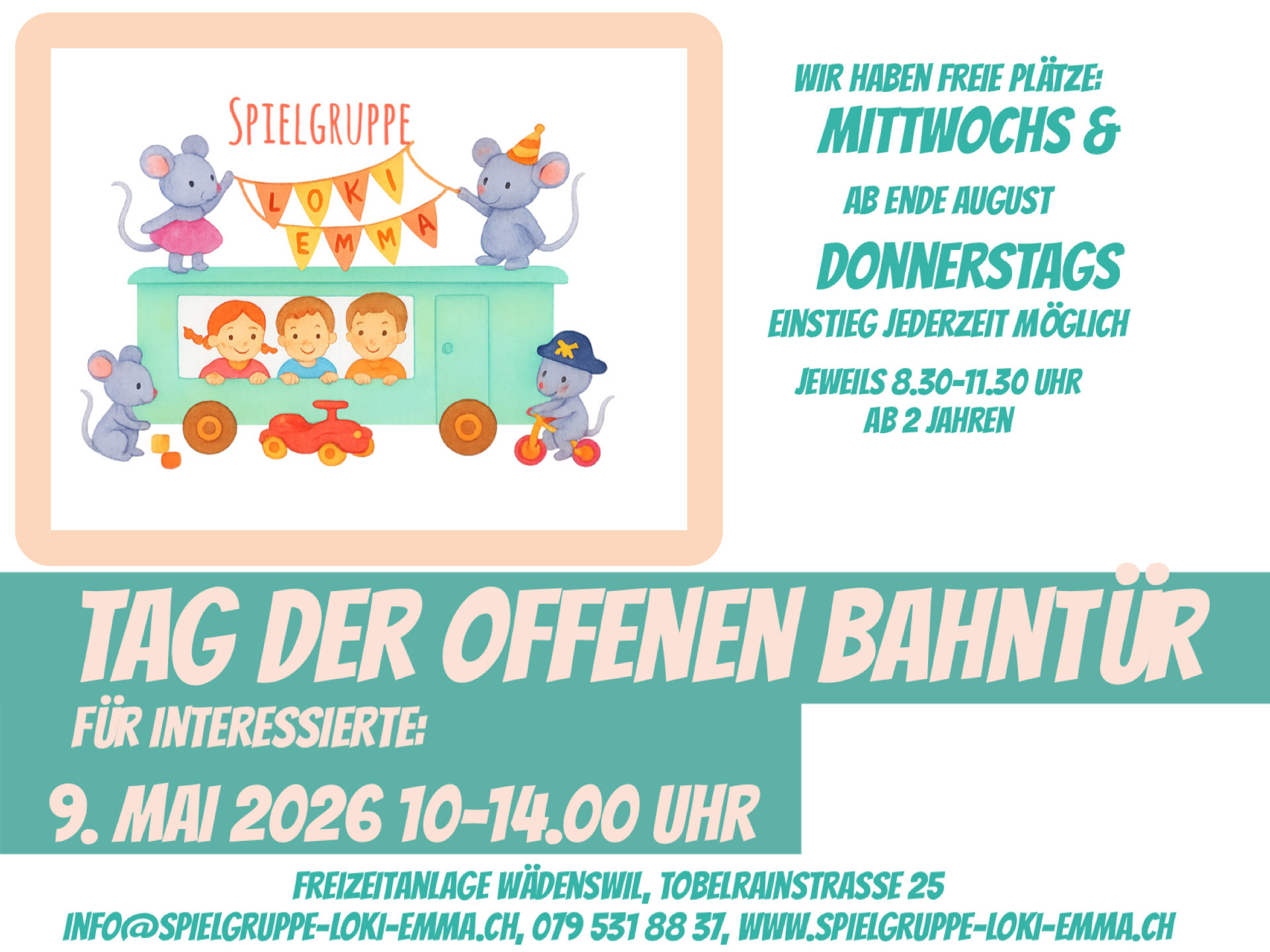 Kommt vorbei und lernt uns und die Loki Emma kennen. Gerne geben wir euch einen kleinen Einblick in unseren Spielgruppenalltag.